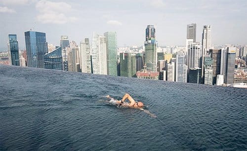 55 poschodí nad rušnými ulicami Singapúru by ste určite neočakávali olympijský bazén, no vo svete kde vládnu peniaze nie je nič nemožné.